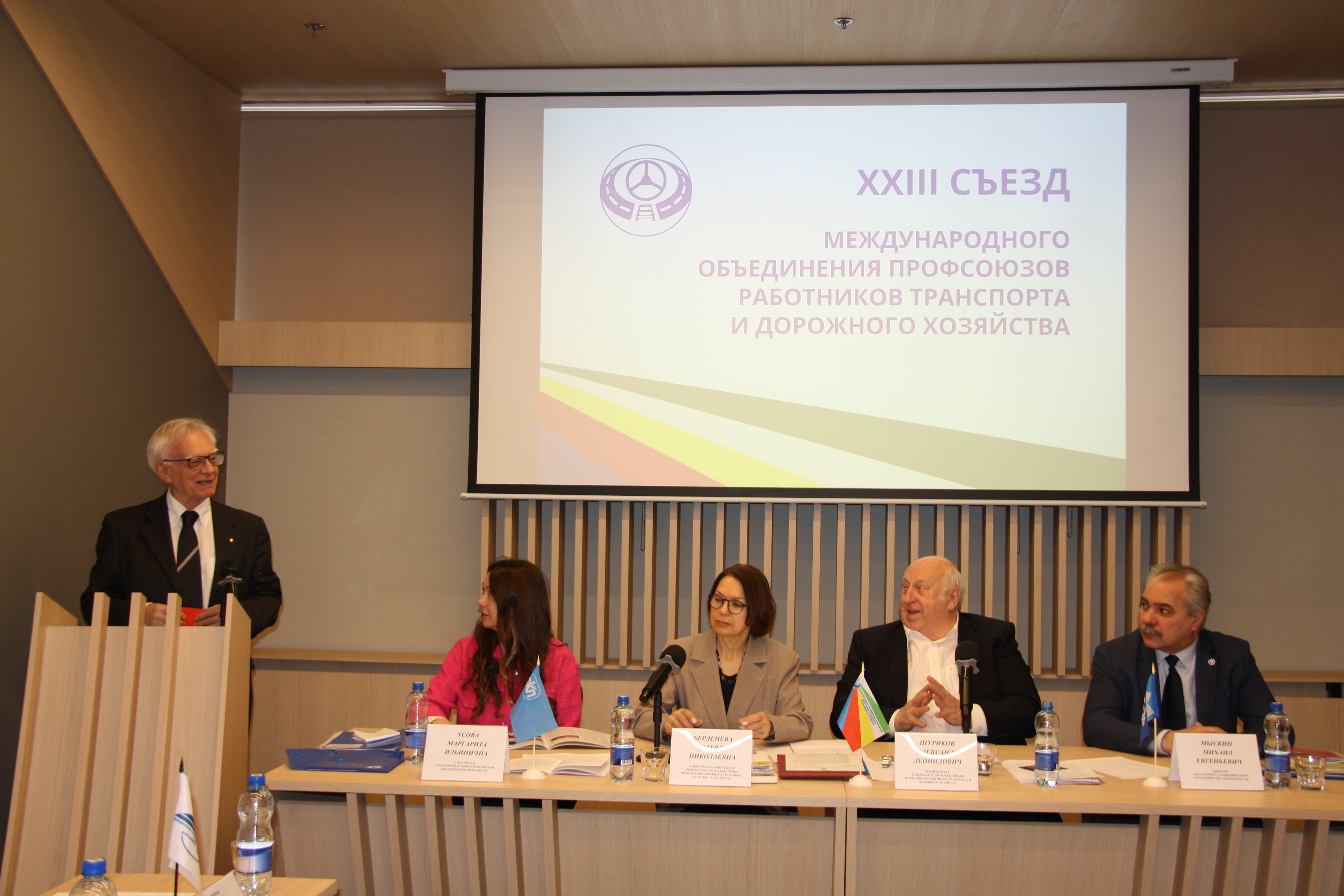 总工会同盟会副秘书长 Usova Margarita Ilyinichna, 独联体执行委员会经济合作司司长 Myskin Mikhail Evgenievich,政府间道路工人理事会主席 Karimov Buri Bachabekovich,国际运输学院院长Dosenko Victor Alexandrovich,国际运输学院院长,运输和道路工人工会国际协会青年理事会主席Bondartsov Artem Andreevich,也参加并致欢迎辞,以及我们的同事,总工会同盟会的成员。