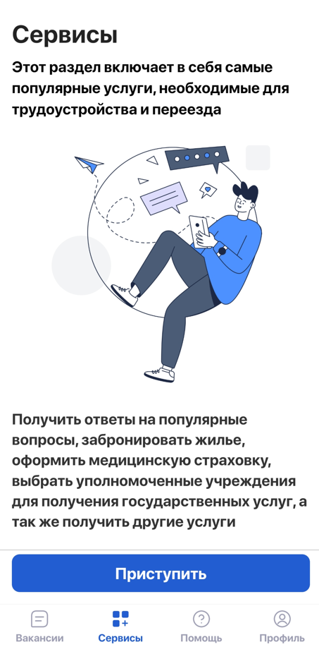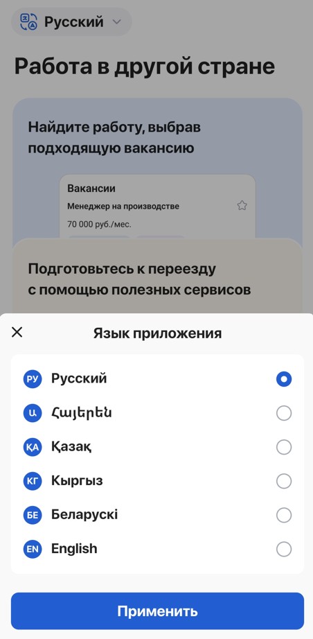 Мобильное приложение «Работа в ЕАЭС» – это банк вакансий и резюме для работодателей и трудящихся Армении, Узбекистана, России, Беларуси и Киргизии. От других банков отличается возможностью мигранта заранее оформить документы для переезда, а для предпринимателей – найти и принять на работу легального мигранта, сразу готового к ней.